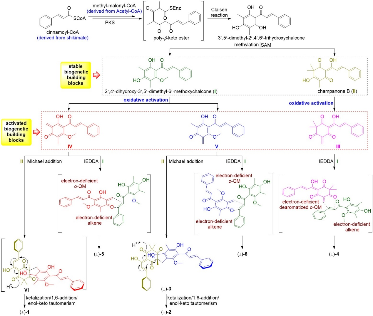基于化合物1–6、I和II的结构特征,作者对该类化合物的生物合成途径进行了探讨,推测这些结构新颖的化合物是由生源砌块I–V组装而成,涉及的关键生源反应包括迈克尔加成反应、半缩酮化/1,6-加成/烯醇-酮式互变串联反应、反电子需求Diels–Alder反应。其中,化合物I和II为稳定型生源砌块,而化合物III–IV被认为是由I和II经氧化活化而生成的一类具高反应活性的邻亚甲基苯醌类活化型生源砌块。