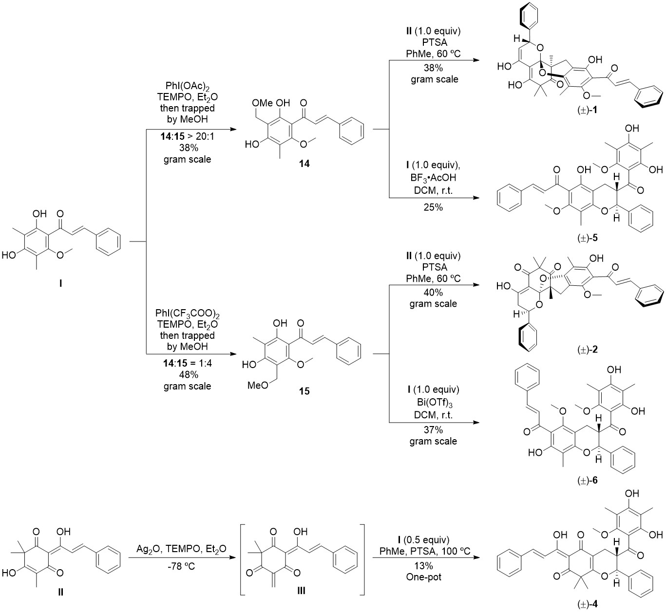 基于以上生物合成途径推测和生源砌块分析,作者采用基于生源砌块的合成策略对上述化合物进行了集群式仿生合成。首先,以商业可得的间苯三酚为起始原料,分别以克级以上规模合成了稳定型生源砌块I和II。随后,采用一锅法,通过氧化活化I生成活化型砌块IV和V,进一步与砌块II发生串联反应直接生成目标产物1和2。由于该方法的产率和选择性差,作者又通过筛选一系列氧化剂,选择性活化砌块I生成稳定的中间体14和15,后者在路易斯酸或质子酸的作用下生成相应的活化型砌块IV和V,进而实现了化合物1、2、5和6的选择性合成。最后,运用类似的方法,作者又通过一锅法实现了化合物4的合成。