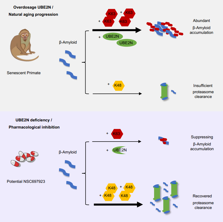 在AD小鼠模型和自然衰老的猴脑中过表达UBE2N可通过K63位泛素化,促进Aβ蛋白的累积。利用CRISPR/Cas9敲低UBE2N或利用其小分子抑制剂NSC697923可通过减少K63位泛素化修饰,来降低脑内Aβ白的积累。