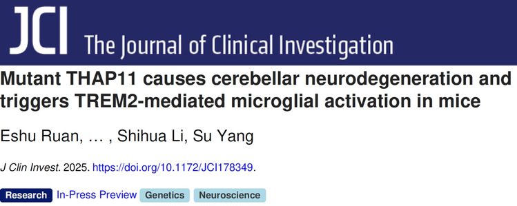 实验室杨甦/李世华团队在国际权威期刊Journal of Clinical Investigation(一区Top,IF 13.3)发表题为“Mutant THAP11 causes cerebellar neurodegeneration and triggers TREM2-mediated microglial activation in mice”的研究论文(论文链接:https://www.jci.org/articles/view/178349)。该研究建立了全球首个脊髓小脑性共济失调51亚型(SCA51)的动物模型,并系统解析了致病基因THAP11的时空表达特征以及其致病机制。
