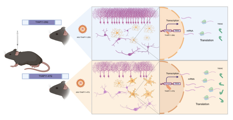综上所述,本研究通过构建 SCA51 转基因动物模型,深入探讨了突变THAP11引发神经退行性变的分子机制。研究发现,成年脑内THAP11基因敲低并未引起显著的神经元丢失,这一关键结果为开发基于THAP11表达调控的靶向治疗策略提供了理论依据。更为重要的是,突变THAP11-47Q在小鼠脑内诱发典型的蛋白聚集以及小脑特异性的神经退行性病变,使SCA51成为研究神经退行性疾病中选择性易感机制的理想模型。本研究还首次揭示了 TREM2 介导的小胶质细胞活化在polyQ疾病中具有特异性,其激活模式和致病效应呈现明显的疾病背景依赖性。这一创新性发现不仅拓展了对神经退行性疾病免疫调控机制的理解,也为相关疾病的免疫干预治疗提供了新的思路和潜在靶点。