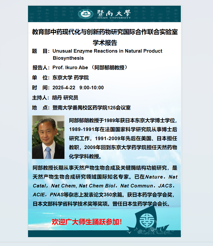 学术报告 — Prof. lkuro Abe:Unusual Enzyme Reactions in Natural Product Biosynthesis