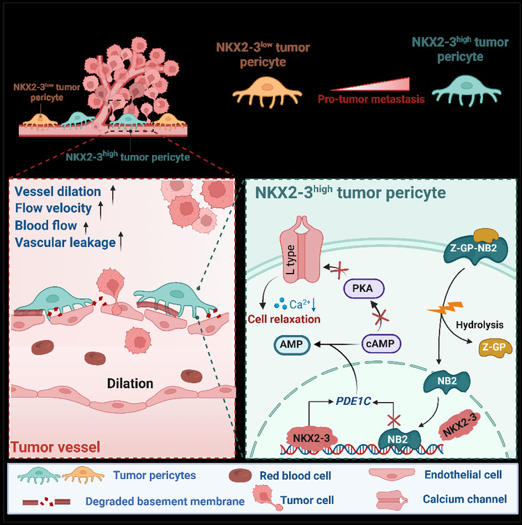 血液动力学对循环肿瘤细胞的存活和外渗具有重要作用,然而血液动力学对肿瘤细胞内渗的影响仍然未知。研究发现,原发灶中高表达NKX2-3的肿瘤周细胞可调控肿瘤血管舒张功能,促进结直肠癌肝转移。机制上,NKX2-3通过PDE1C/cAMP/PKA信号轴抑制肿瘤周细胞的钙内流,诱导肿瘤血管舒张,增加血通量和血管渗漏,促进结直肠癌患者的血行转移。通过基因缺失Nkx2-3或TCF21片段肽阻断肿瘤周细胞NKX2-3的转录活性,诱导肿瘤局部血管收缩,减少血流量,可显著抑制肿瘤转移。(Nat Commun. 2025 Aug 2;16(1):7115)