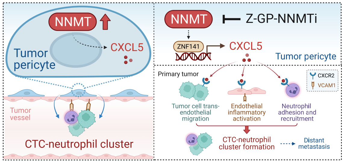 循环肿瘤细胞(circulation tumor cells,CTC)-中性粒细胞团簇的形成对肿瘤血行转移至关重要,但其形成的位置和机制未知。该团队利用多色免疫荧光,发现CTC-中性粒细胞团簇主要聚集于原发灶肿瘤血管内皮内壁;利用单细胞测序在肝转移性结直肠癌原发灶中发现了一种高表达烟酰胺N-甲基转移酶(NNMT)的周细胞新亚群;机制研究表明,肿瘤周细胞NNMT可通过分泌CXCL5激活CXCR2信号轴,促进血管-免疫界面上结直肠癌细胞、中性粒细胞和内皮细胞之间的相互作用,形成CTC-中性粒细胞簇,增强CTC的存活和转移能力,从而促进结直肠癌的肝转移。在以上研究基础上,该团队自行设计和研制了肿瘤周细胞NNMT靶向抑制剂Z-GP-NNMTi,可阻断 CTC-中性粒细胞簇的形成,从而有效抑制结直肠癌肝转移。(Gut. 2025 Aug 6:gutjnl-2024-334618)