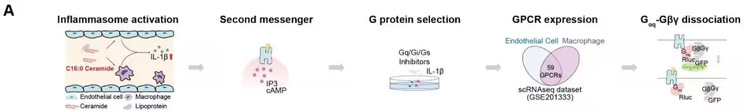 该研究通过系统性筛选,发现神经酰胺C16:0可直接激活Gq偶联的GPCR受体—CYSLTR2和P2RY6,进而触发下游炎症小体信号通路,导致动脉粥样硬化斑块加剧。基因敲除或药物抑制这两个受体,可在不影响血脂水平的情况下显著减轻小鼠动脉粥样硬化病变程度。值得注意的是,在慢性肾病合并动脉粥样硬化模型中,受体缺失或拮抗同样表现出显著保护作用。