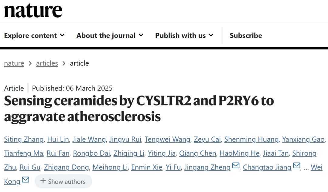 2025年3月,生物活性分子与成药性优化全国重点实验室黄深明研究员在Nature杂志上发表了题为“Sensing ceramides by CYSLTR2 and P2RY6 to aggravate atherosclerosis”的研究论文。该研究首次鉴定出神经酰胺(ceramide)的内源性受体CYSLTR2和P2RY6,系统揭示了神经酰胺通过激活这些受体加重动脉粥样硬化的分子机制。研究发现,在慢性肾病(CKD)患者中,血浆神经酰胺水平升高与冠状动脉疾病的严重程度呈正相关,靶向该通路能够有效缓解慢性肾病相关的动脉粥样硬化病变。此外,研究还通过解析神经酰胺与受体复合物的高分辨率结构,揭示了受体如何选择性识别神经酰胺的作用机制。该研究为动脉粥样硬化及相关心血管疾病的防治提供了新策略。