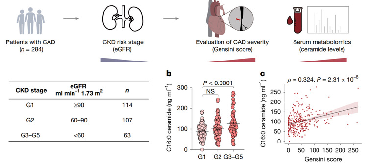 在284例冠心病患者的临床样本研究中,显示随着肾功能下降,患者血浆中多种神经酰胺水平显著上升,且与冠状动脉病变严重程度(Gensini评分)正相关,提示神经酰胺是CKD患者心血管风险的独立预测因子。