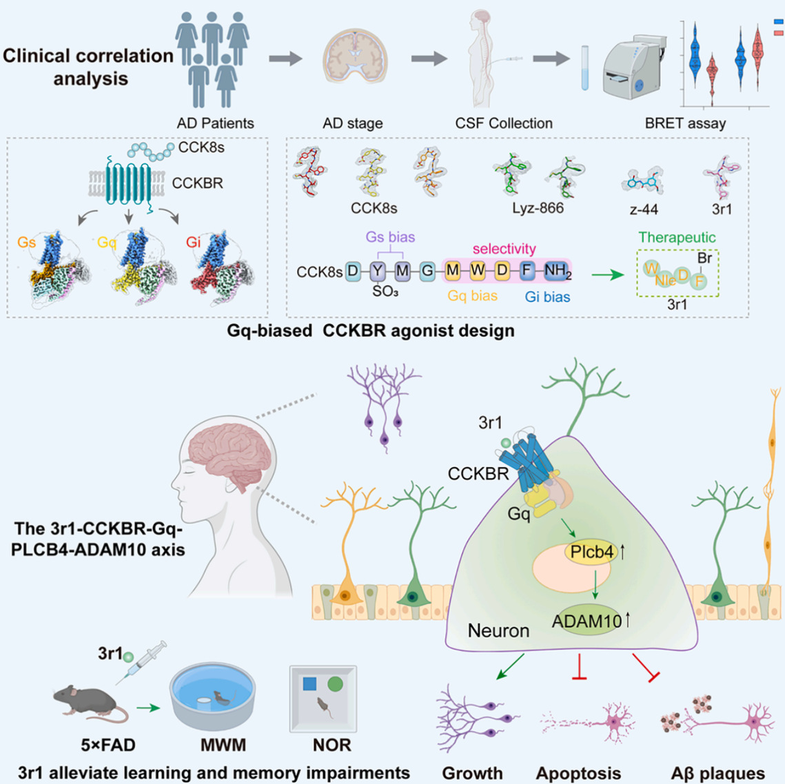 AD以记忆衰退与认知障碍为特征,全球负担持续上升。胆囊收缩素(CCK)是脑内含量最丰富的神经肽之一,通过与CCKBR特异性结合调控情绪、学习记忆、焦虑与恐惧等高级脑功能;外源补充CCK8s可显著改善老年大鼠的空间学习记忆,提示CCK信号通路具备治疗AD的潜力。然而,CCK存在多种亚型并能激活Gs、Gq、Gi等多条通路,如何实现对CCKBR的选择性调控仍是关键科学问题,靶向CCKBR是否能开发治疗AD的药物亟需探索。