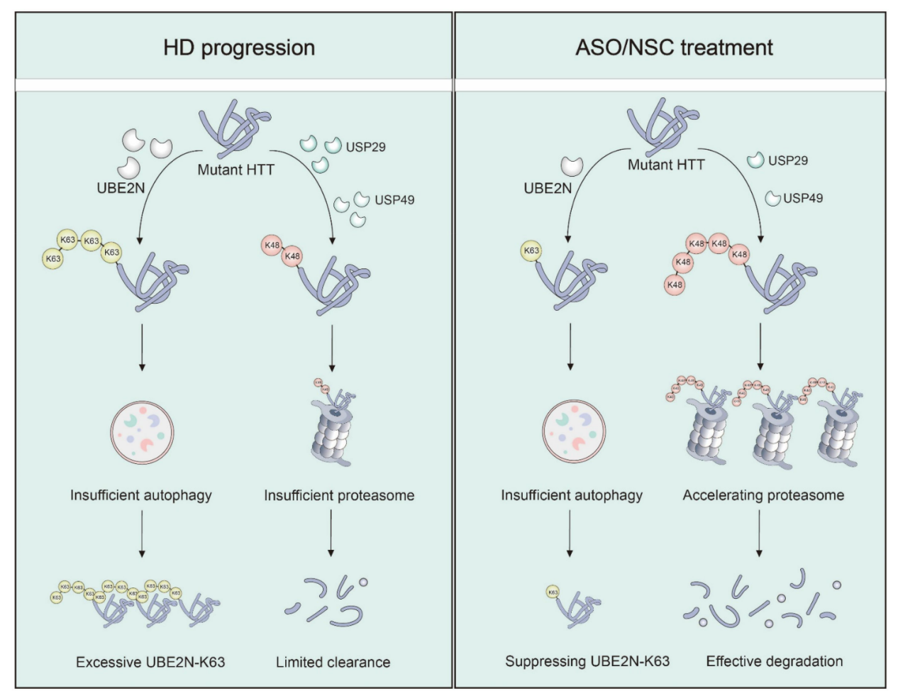 图2 在HD病中,突变HTT与K48和K63多泛素链相连并积累。采用靶向ASOs或抑制剂NSC697923抑制UBE2N,可通过减少K63泛素化与Usp29、Usp49基因;增加K48泛素化与蛋白酶体活性而减少HTT聚集。