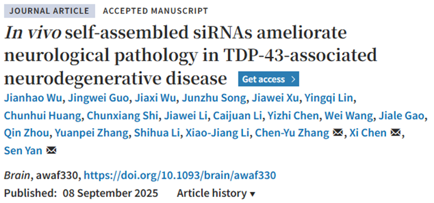 9月8日,实验室闫森团队与南京大学张辰宇/陈熹团队合作在国际权威学术期刊《Brain》在线发表研究论文“In vivoself-assembled siRNAs ameliorate neurological pathology in TDP-43-associated neurodegenerative disease”。该研究开发了一种新型的治疗TDP-43相关神经退行性疾病的基因治疗策略。这一策略克服了传统siRNA递送方法的局限性,为治疗包括ALS和FTD在内的TDP-43相关神经退行性疾病提供了一个更简便、更安全、更高效的治疗策略。