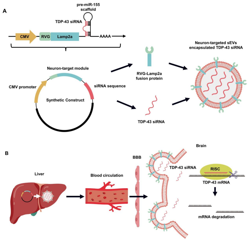 内源性细胞可以选择性地将miRNA包装到小细胞外囊泡(small extracellular vesicles, sEVs)中,sEVs携带miRNA递送到受体细胞中抑制靶基因的表达。并且sEVs具有低免疫原性和良好的生物相容性,能够在体内保护和运输小RNA,以及可工程化穿越血脑屏障的潜力。因此,内源性sEVs系统可能是克服siRNAs递送到中枢神经系统的问题。研究团队创新性地基于合成生物学原理设计了一个靶向TDP-43的体内自组装siRNAs的合成构建体(质粒DNA形式),包含了三个核心功能模块:CMV高效启动子、TDP-43 siRNAs表达骨架以及靶向神经元的RVG-Lamp2a融合蛋白标签。靶向TDP-43的体内自组装siRNAs通过静脉注射进入机体后会被肝脏摄取吸收,其后肝脏细胞会表达体内自组装siRNAs各个功能模块,表达合成pre-miRNA经过内源性miRNA加工机制形成成熟的TDP-43 siRNAs,并且这些TDP-43 siRNAs会自发组装到RVG肽修饰的sEVs中。这些sEVs能够携带TDP-43 siRNAs会进入血液循环,最终RVG靶向标签的作用下通过血脑屏障高效地递送到神经中枢系统,靶向TDP-43 mRNA从而降低TDP-43的表达水平。