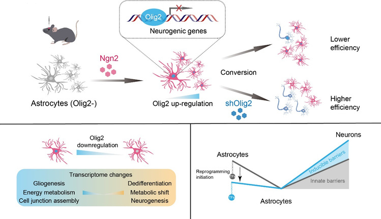 研究团队发现,当利用腺相关病毒(AAV)载体将神经转录因子Ngn2递送至小鼠大脑皮层星形胶质细胞,启动重编程时,原本在此类细胞中几乎不表达的转录因子Olig2被迅速、强烈地诱导表达。这一现象提示,星形胶质细胞并非被动接受“改造”,而是会主动激活一个抵抗程序。