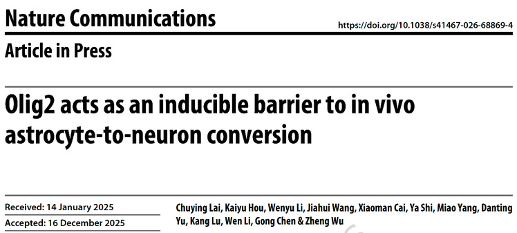 实验室吴政、陈功教授团队主导的研究发表在《Nature Communications》杂志(IF 15.7)上。该研究首次揭示,在星形胶质细胞启动重编程时,其自身会迅速“激活”一种名为Olig2的转录因子,作为“可诱导屏障”主动抵抗命运转变;降低Olig2能使Ngn2介导的星形胶质细胞向神经元转化效率提升约三倍,并产生具有电生理功能的神经元,为深入理解细胞重编程的阻力机制提供了全新视角,并为提高神经再生治疗效果提供了潜在新靶点。