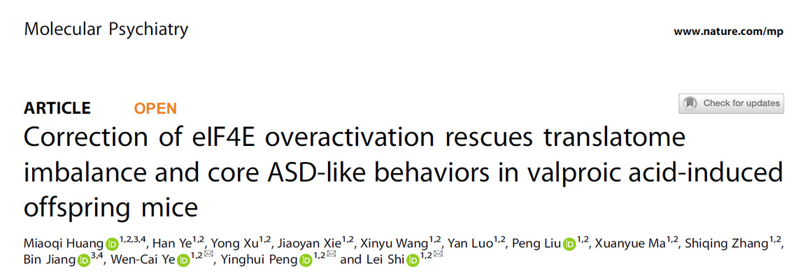 近日,实验室师蕾研究员和叶文才教授团队在Molecular Psychiatry(Nature子刊,精神病学/神经科学顶刊)在线发表了题为“Correction of eIF4E overactivation rescues translatome imbalance and core ASD-like behaviors in valproic acid-induced offspring mice”的最新研究。师蕾研究员、彭颖慧博士、叶文才教授为论文的共同通讯作者,黄妙奇博士为论文的第一作者。