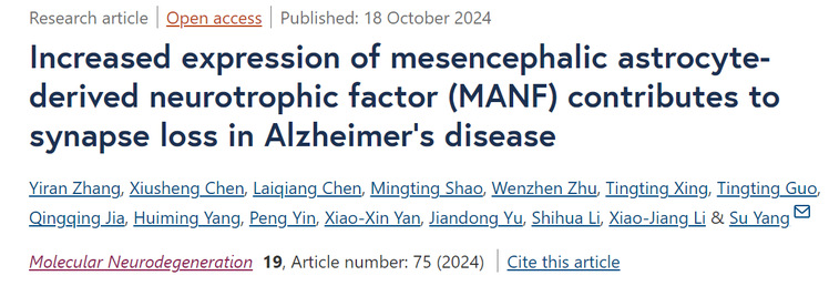 2024年10月18日,实验室杨甦/李晓江团队在国际权威期刊Molecular Neurodegeneration(一区Top,IF 14.9)发表题为“Increased expression of mesencephalic astrocyte-derived neurotrophic factor (MANF) contributes to synapse loss in Alzheimer’s disease”的研究论文。研究团队发现MANF过表达会导致突触蛋白表达水平下降和突触数量减少,进而影响小鼠的学习和记忆功能。在AD小鼠模型中增加或降低MANF的表达会相应的加剧或缓解AD病理表型。这些结果与以往研究中MANF发挥神经保护功能的发现不同,提示MANF具有复杂的神经生物学功能,同时也揭示了ER-stress与AD发病机制的关联。阿尔兹海默症(Alzheimer’s disease, AD)是全球患病人数最多的神经退行性疾病,其典型病理特征是海马区和大脑皮层出现进行性的神经突触丢失。内质网应激(ER-stress)是AD的早期病理标志之一,然而ER-stress对AD疾病发生