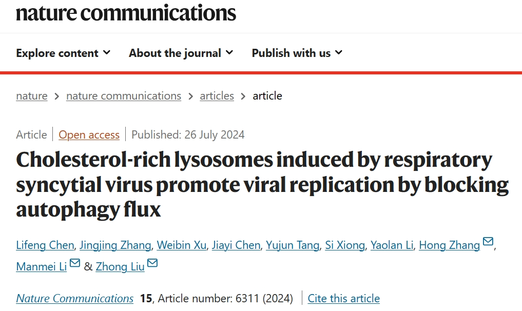 7月26日,实验室刘忠/李满妹/张宏团队在《Nature Communications》在线发表题为“Cholesterol-rich lysosomes induced by respiratory syncytial virus promote viral replication by blocking autophagy flux”的研究论文。该研究阐明了RSV共调控溶酶体胆固醇代谢重编程和自噬的分子机制,并揭示了LDLR有望作为抗RSV药物开发的潜在新靶点。在文章中,课题组发现RSV感染通过下调溶酶体酸性脂肪酶(LAL)的活性来阻断胆固醇从溶酶体转运至内质网(ER),激活SREBP2-LDLR信号轴,并促进溶酶体中外源胆固醇的摄取和积累。RSV诱导的高胆固