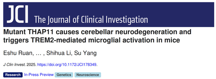 实验室杨甦/李世华团队在国际权威期刊Journal of Clinical Investigation(一区Top,IF 13.3)发表题为“Mutant THAP11 causes cerebellar neurodegeneration and triggers TREM2-mediated microglial activation in mice”的研究论文(论文链接:https://www.jci.org/articles/view/178349)。该研究建立了全球首个脊髓小脑性共济失调51亚型(SCA51)的动物模型,并系统解析了致病基因THAP11的时空表达特征以及其致病机制。多聚谷氨酰胺(polyQ)疾病是一类由单基因突变引起的神经退行性疾病。长期以来,已知的polyQ疾病共有九种,包括亨廷顿舞蹈症(Huntingtons disease)以及多种脊髓小脑性共济失调(SCA)亚型。2023年,研究者鉴定出一种新的SCA亚型——SCA51,被确认为第十种polyQ疾病。该病由编码转录因子THAP11的基因一号外显子中CAG重复序列的扩增突变引起。SCA51患者表现出小脑萎