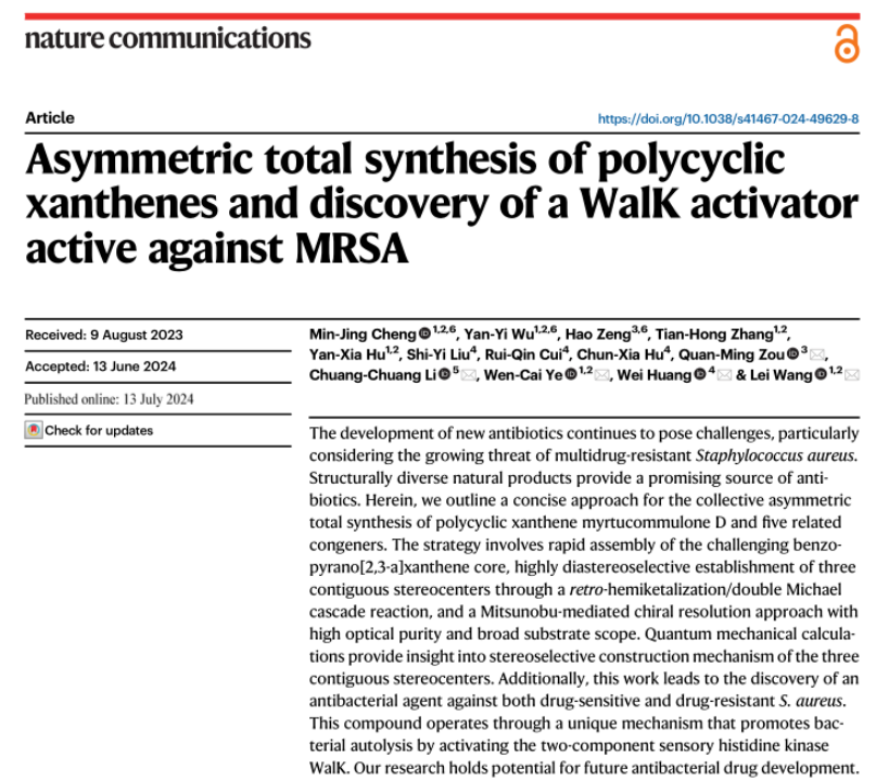 近期,实验室叶文才教授/王磊研究员与第二临床医学院黄维研究员、南方科技大学李闯创教授、陆军军医大学邹全明教授合作,在Nature Communications(IF=14.7)上发表了题为“Asymmetric total synthesis of polycyclicxanthenes anddiscovery of a WalK activator active against MRSA”的研究论文。首次完成了6个复杂天然多环氧杂蒽的集群式不对称全合成,并发现了首个具显著抗MRSA活性的新型WalK激活剂。暨南大学副研究员程民井、博士研究生伍燕仪、陆军军医大学曾浩教授为共同第一作者。耐药菌感染特别是耐甲氧西林金黄色葡萄球菌 (MRSA) 感染,是威胁全球公共健康的重大问题。传统的抗生素已出现不同程度的耐药性问题,因此,开发新型抗生素迫在眉睫。氧杂蒽类天然产物具有显著的抗菌作用,但在天然中含量很低,限制了其进一步的开发利用,本文对这类化合物的化学合成和作用机制进行了研究。(图 1.氧杂蒽类天然产物的化学结构。)作者开发了一条高效简洁的合成新策略,由廉价、商业可得的原料出发,利用新开发