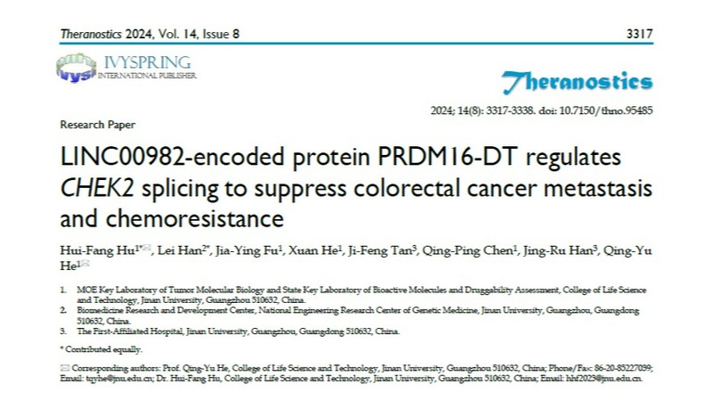 何庆瑜教授和胡会芳副研究员团队揭示了LncRNA编码的新蛋白质驱动肠癌转移及耐药的新机制