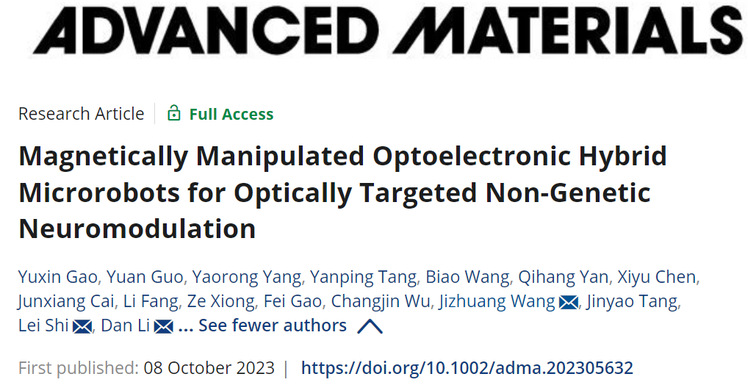 近日,实验室王吉壮/李丹教授团队与师蕾教授团队合作在国际权威期刊Advanced Materials(影响因子29.4)上发表了题为“Magnetically Manipulated Optoelectronic Hybrid Microrobots for Optically Targeted Non-Genetic Neuromodulation”的重要研究成果。