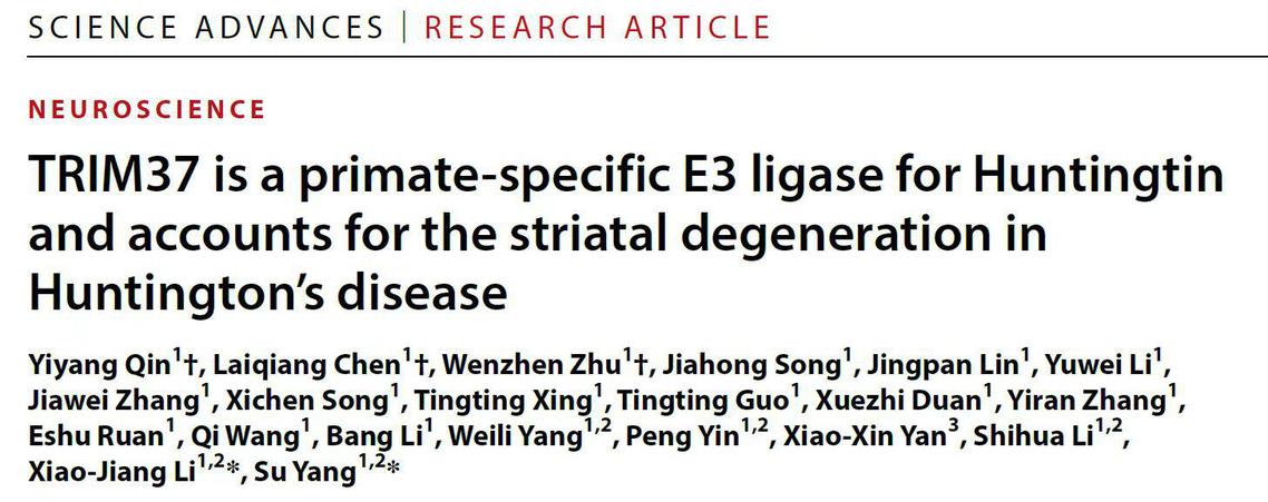 2024年5月17日,杨甦和李晓江团队在国际权威期刊Science Advances(一区Top,IF 13.6)发表题为“TRIM37 is a primate specific E3 ligase for Huntingtin and accounts for the striatal degeneration in Huntington’s disease”的研究论文。通过比较不同物种(食蟹猴、小鼠、人)的不同脑区内HTT蛋白的表达水平,揭示了HD病程中纹状体神经元特异性死亡的分子机制。(论文截图)亨廷顿舞蹈症(Huntington’s disease,HD)是一种常染色体显性遗传的神经退行性疾病,属于多聚谷氨酰胺(polyglutamine,polyQ)疾病家族,由亨廷顿基因(Huntingtin,HTT)一号外显子区域中的 CAG重复异常扩增(超过36次)所导致。HTT基因编码的HTT蛋白在人脑中广泛表达,但HD患者的纹状体是发生神经元死亡最严重的脑区。以往利用HD小鼠模型的研究尚不能很好的解释该现象,其主要原因是鼠脑与人脑存在较大差异,且HD小鼠模型缺乏明显的神经元死亡。通